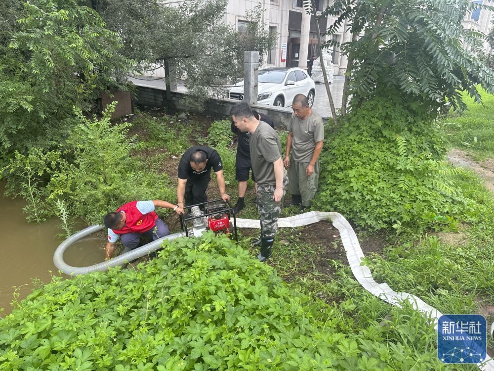 7月27日,在遼寧省鞍山市千山區(qū)湯崗子理療醫(yī)院,湯崗子街道工作人員在清理積水。 新華社發(fā)