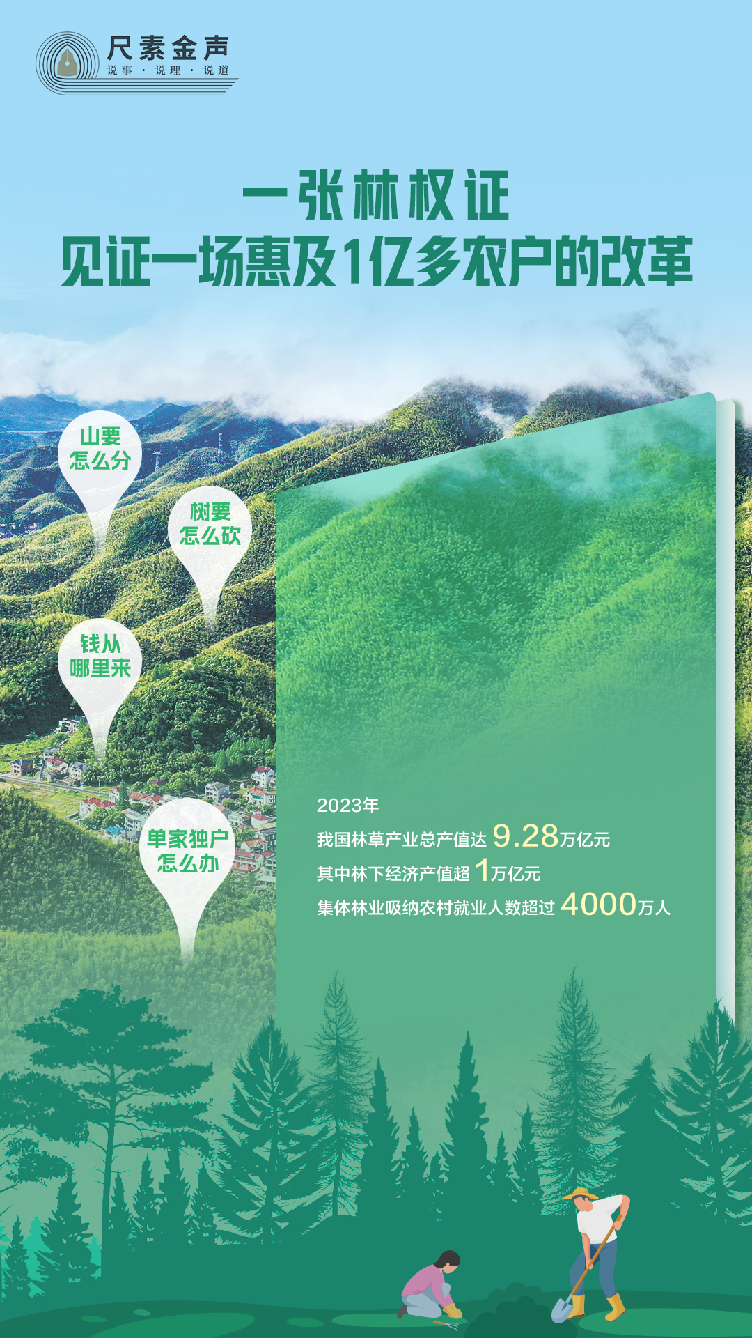 林改,改出了滿目青山,改出了金山銀山,廣大集體林區(qū)發(fā)展添活力,億萬林農鼓腰包。去年,我國林草產業(yè)總產值達9.28萬億元,其中林下經濟產值超1萬億元,經濟林產量達2.26億噸,成為繼糧食、蔬菜之后的第三大農產品,集體林業(yè)吸納農村就業(yè)人數(shù)超過4000萬人。