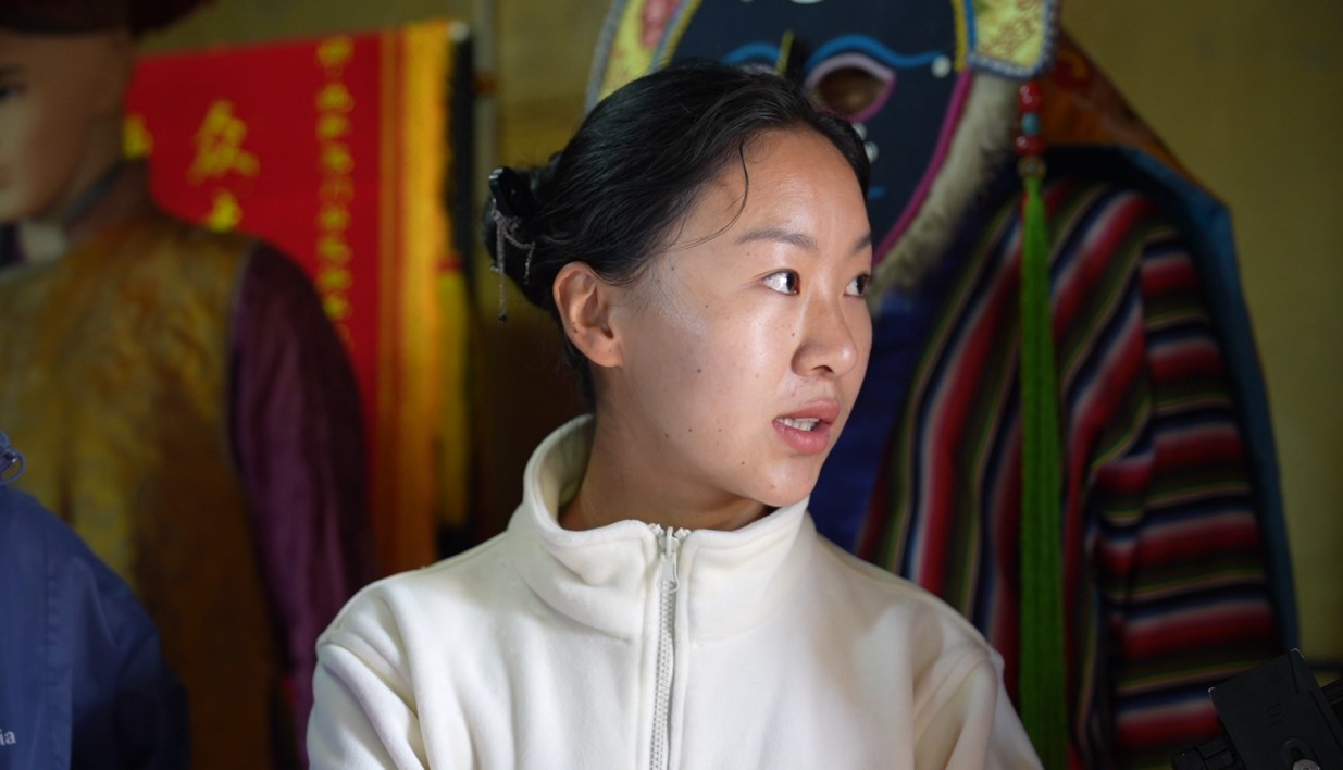 ??巴桑德吉在講述她與唐卡的故事(7月23日攝)。 新華網(wǎng)發(fā) 謝林翰 攝