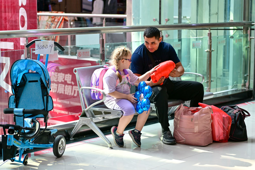 在中哈霍爾果斯國(guó)際邊境合作中心,來自哈薩克斯坦的游客在購(gòu)物后休息(7月27日攝)。