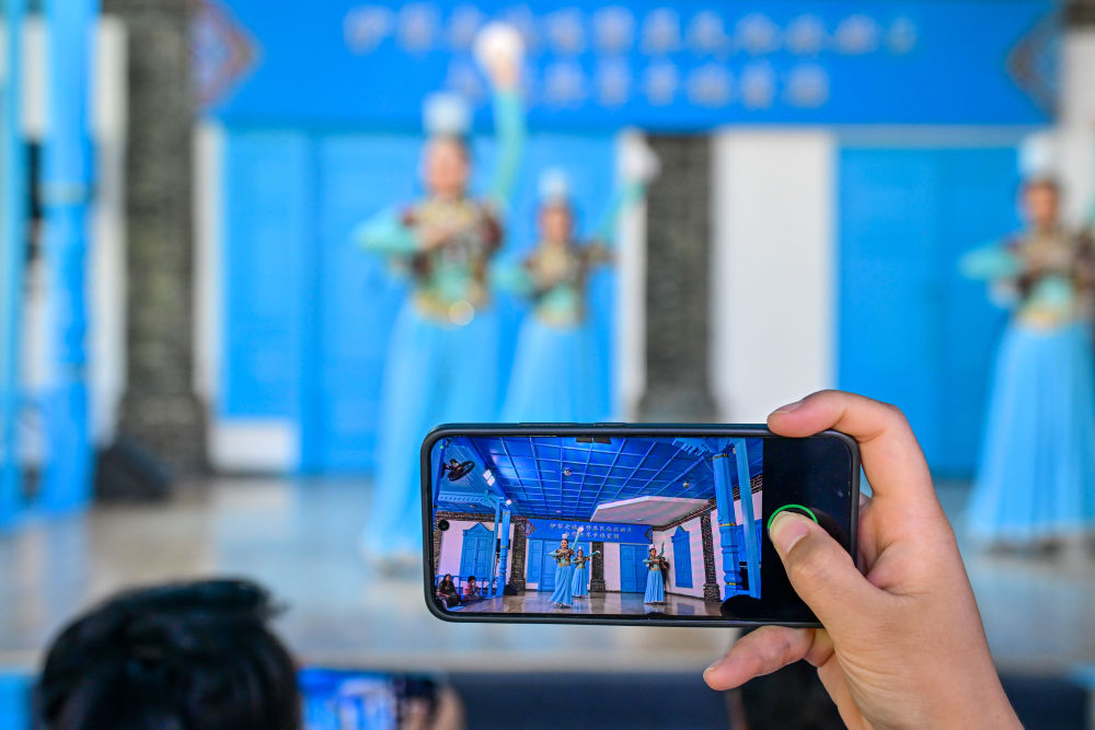 在伊犁哈薩克自治州伊寧市喀贊其民俗旅游區(qū),游客在錫伯車馬店欣賞文藝表演(7月27日攝)。
