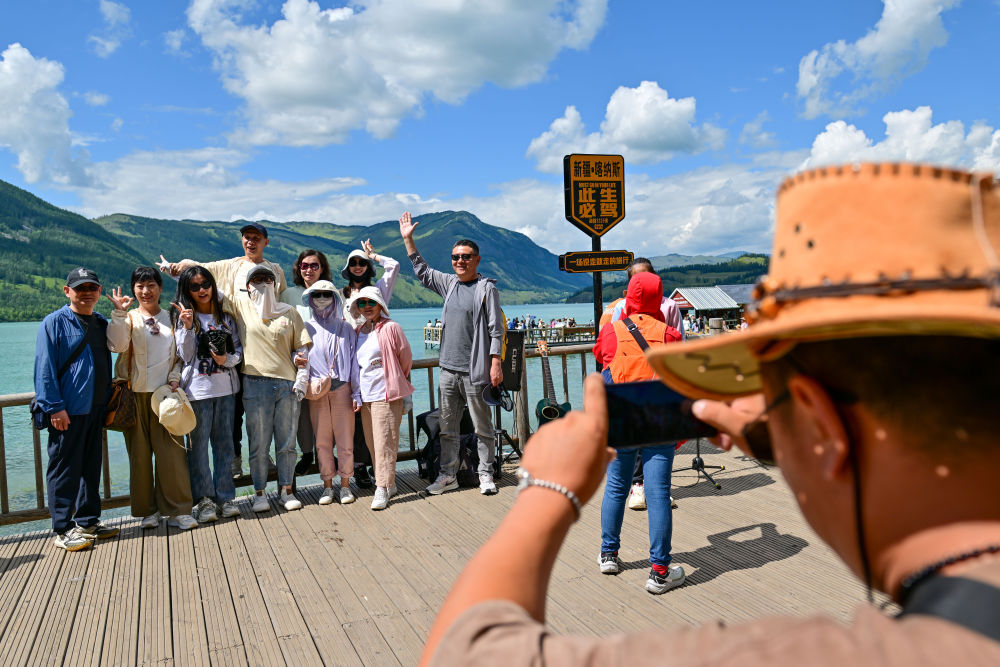 游客在新疆阿勒泰地區(qū)福??h烏倫古湖合影留念(7月21日攝)。