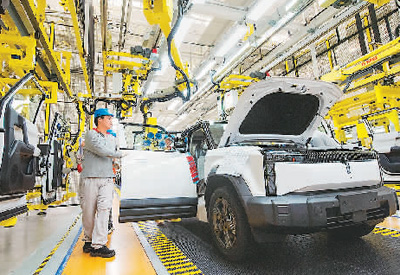 今年上半年,安徽省蕪湖市出口電動(dòng)載人汽車數(shù)量1.49萬(wàn)輛,同比增長(zhǎng)144.3%。圖為在蕪湖市奇瑞新能源愛咖生態(tài)科技有限公司新能源汽車生產(chǎn)車間,工人在進(jìn)行組裝生產(chǎn)作業(yè)。