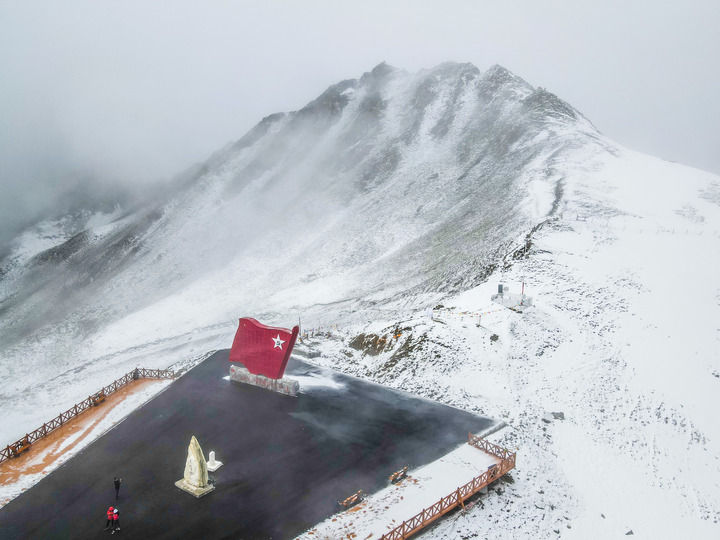 這是位于四川夾金山海拔4114米埡口的紅色主題文化景觀(2021年5月12日攝,無(wú)人機(jī)照片)。新華社發(fā)(郝立藝 攝)