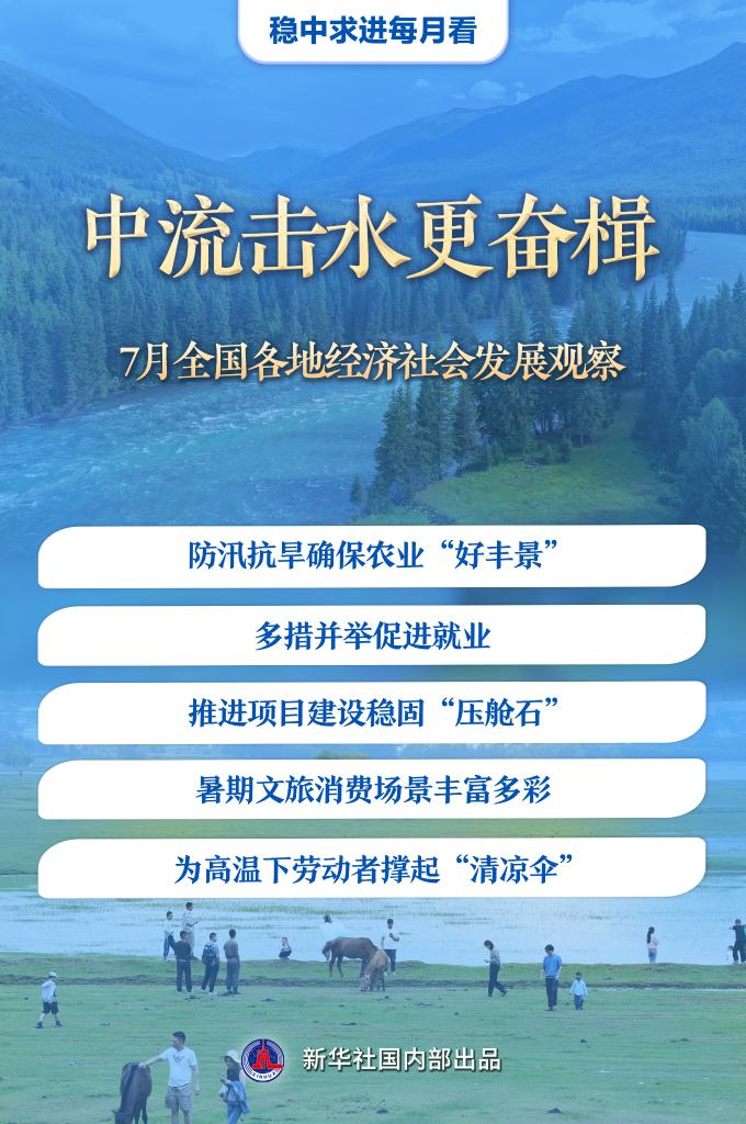 7月是下半年經(jīng)濟運行開局的關(guān)鍵時段。防汛抗旱應(yīng)對極端天氣挑戰(zhàn),促就業(yè)推出新舉措,重大項目壓茬推進……行至年中,各地凝聚力量,奮楫前進,不斷增進民生福祉,更好地推動高質(zhì)量發(fā)展。