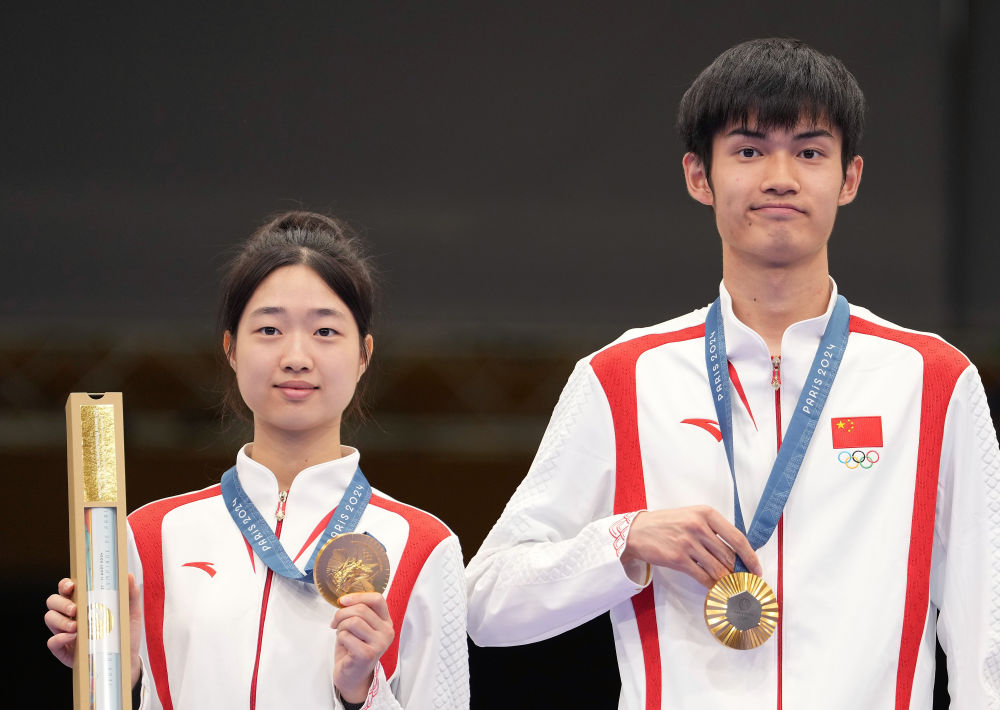 7月27日,冠軍中國選手黃雨婷(左)/盛李豪在頒獎(jiǎng)儀式上。當(dāng)日,在法國沙托魯舉行的巴黎奧運(yùn)會(huì)射擊10米氣步槍混合團(tuán)體決賽中,中國選手黃雨婷/盛李豪奪冠,贏得巴黎奧運(yùn)會(huì)首枚金牌。新華社記者 鞠煥宗 攝