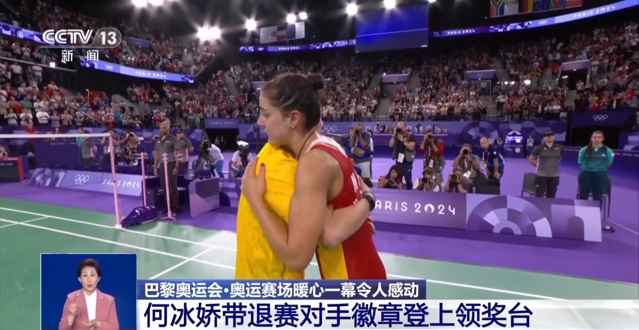 在羽毛球女單決賽中,中國(guó)選手何冰嬌0∶2不敵韓國(guó)的安洗瑩,收獲一枚銀牌。頒獎(jiǎng)儀式上,何冰嬌在舉起獎(jiǎng)牌的同時(shí),拿出了一枚帶有西班牙國(guó)旗的徽章,向半決賽中因傷退賽的西班牙名將馬林送上慰問(wèn),祝愿她能夠早日康復(fù),重回賽場(chǎng)。運(yùn)動(dòng)員之間不只有競(jìng)爭(zhēng),也有惺惺相惜、互相尊重,這也是奧林匹克精神的一種體現(xiàn)。