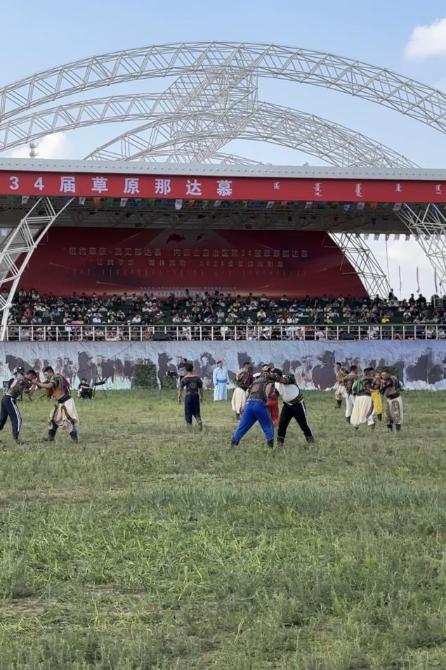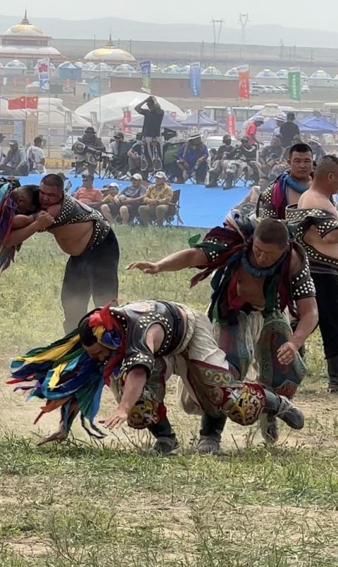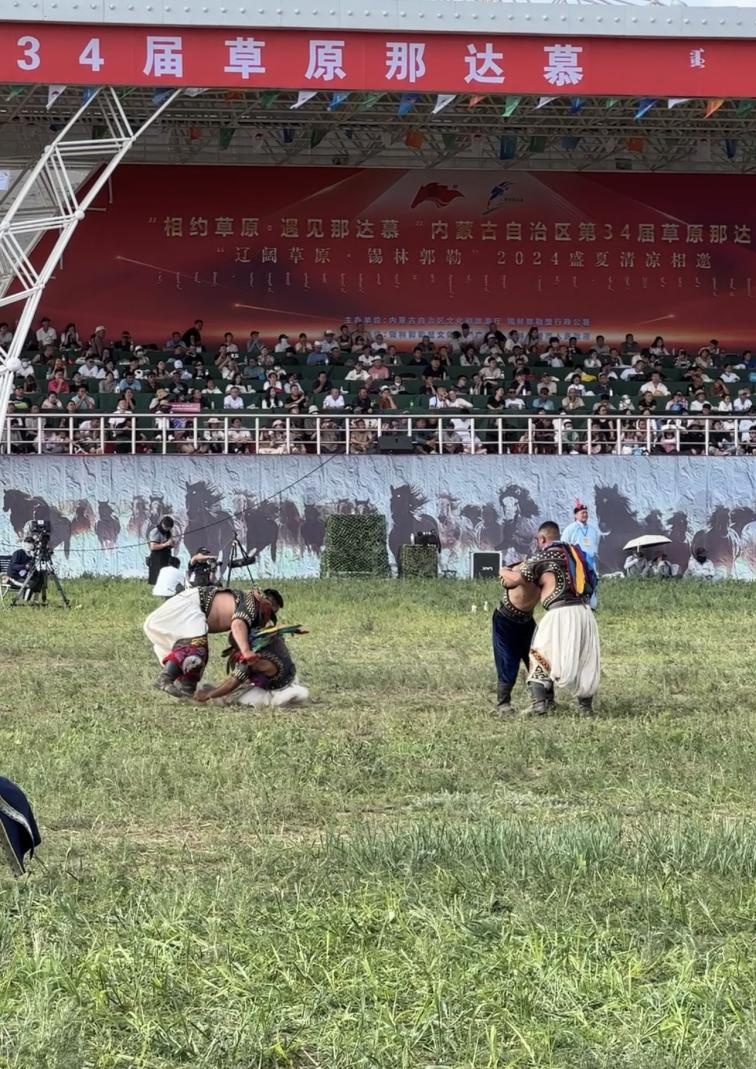那達慕現(xiàn)場同時進行多組搏克比賽
