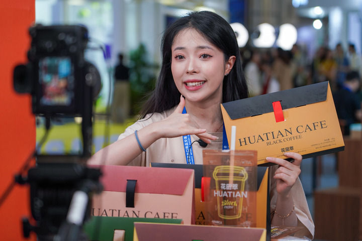 2024年7月24日,參展商在南博會咖啡產(chǎn)業(yè)館直播帶貨。新華社記者 王靜頤 攝