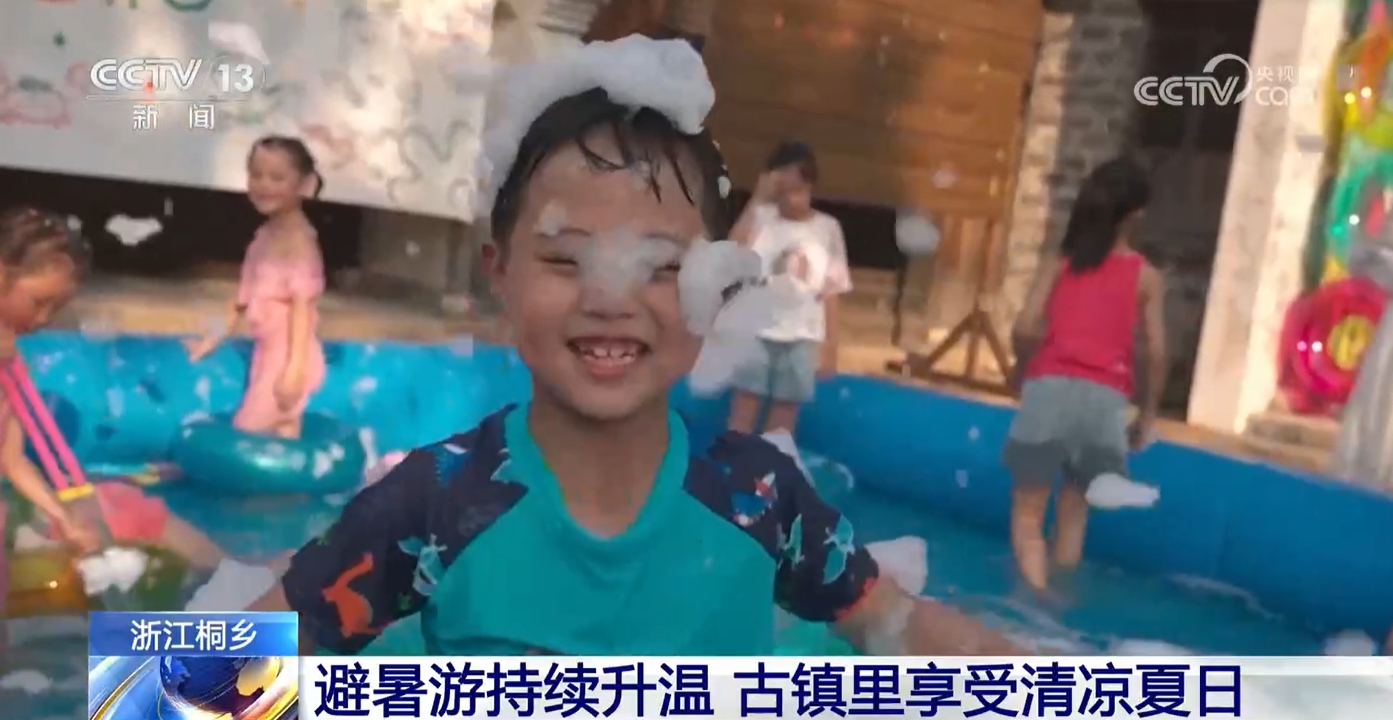 在古鎮(zhèn)景區(qū)的充氣泳池內(nèi),小朋友們游泳、打水仗,時不時還上演一場泡泡大戰(zhàn),水槍射擊戰(zhàn)、水球打靶等親水項目,讓孩子們盡享戲水的清涼時光。