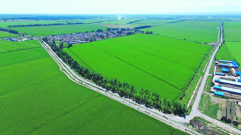 俯瞰博樂市小營盤鎮(zhèn)呼和布熱村一角(8月8日無人機(jī)攝)。放眼該村,平坦的農(nóng)村公路、綠色的條田、整齊的村莊,形成一幅美麗的鄉(xiāng)村畫卷。 賀程攝