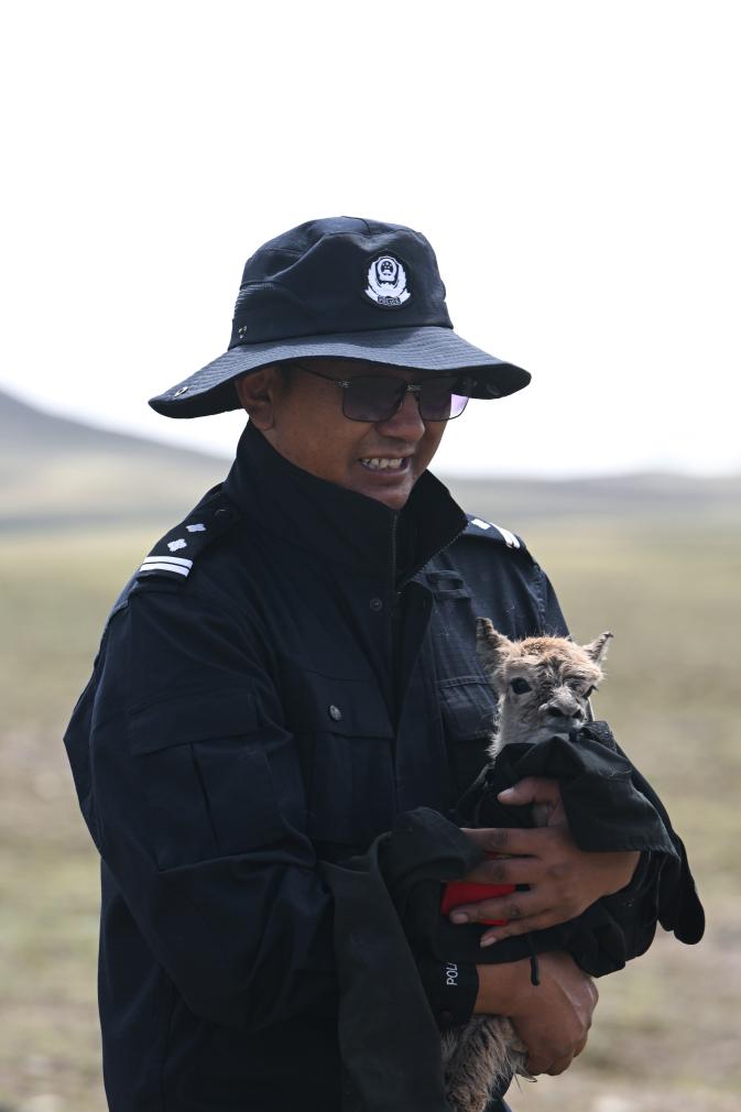 7月8日,青海省公安廳森林警察總隊曲麻萊森林公安局局長秋松多杰在照顧一只小藏羚羊。新華社記者 張龍 攝