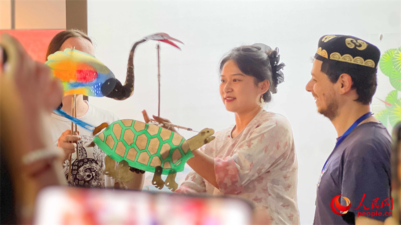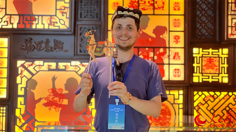 俄羅斯翻譯家、現(xiàn)任莫斯科物理技術(shù)學院中文系副教授羅子毅與皮影合影。人民網(wǎng) 李欣洋攝