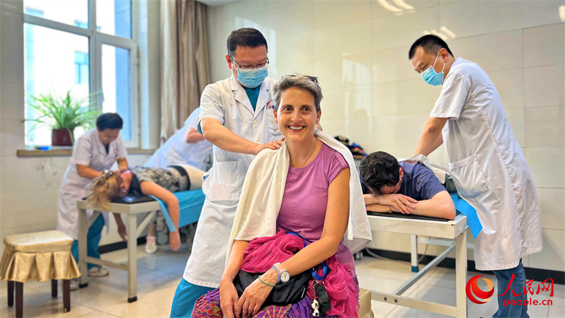 在新疆醫(yī)科大學一附院(昌吉分院),中外漢學家、翻譯家、作家參觀中醫(yī)館,體驗中醫(yī)文化。人民網(wǎng) 李欣洋攝