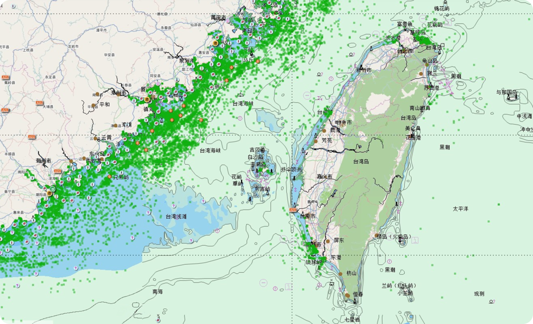 ?。_灣海峽航行船舶實時分布情況(綠點代表正在臺灣海峽航行的船只)