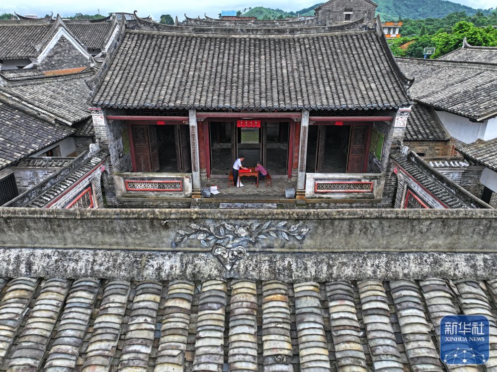 8月15日,楹聯(lián)愛好者在大蘆村古宅里寫對(duì)聯(lián)(無人機(jī)照片)。