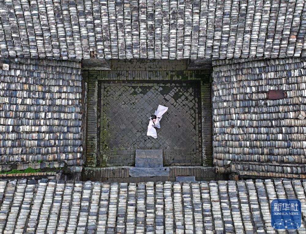 8月16日,一名身著漢服的游客在大蘆村古建筑群里跳舞(無人機(jī)照片)。