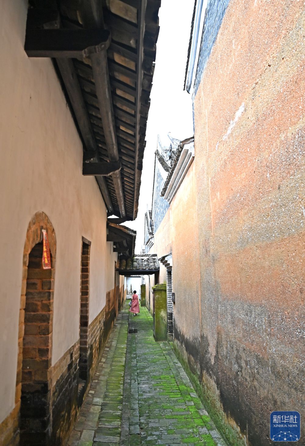 8月16日,一名村民在大蘆村一條小巷里穿行。