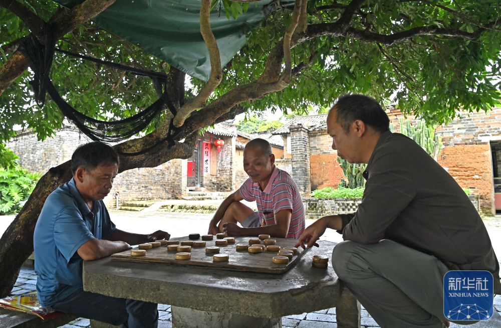 8月16日,幾名村民在大蘆村古宅前的樹下下棋。