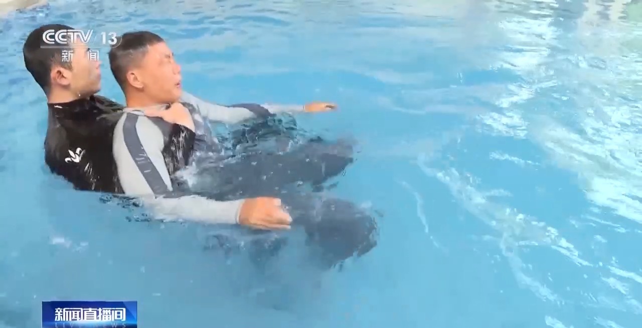 國(guó)家消防救援局水域救援訓(xùn)練基地教練員 李勝龍:我們不要正面游向他,要盡量從他的背后,然后靠近他的時(shí)候要轉(zhuǎn)動(dòng)他的髖部,使他背向我,因?yàn)槟缢咚诨艁y的時(shí)候會(huì)抓緊我們的身體,也就是我們俗稱的“抓緊最后一根稻草”。他會(huì)死死抓住我們,影響我們的救援,所以說我們要從背后接近他,然后托住他的頭部 、頸部,使他的頭部始終露出水面,降低他的恐慌。
