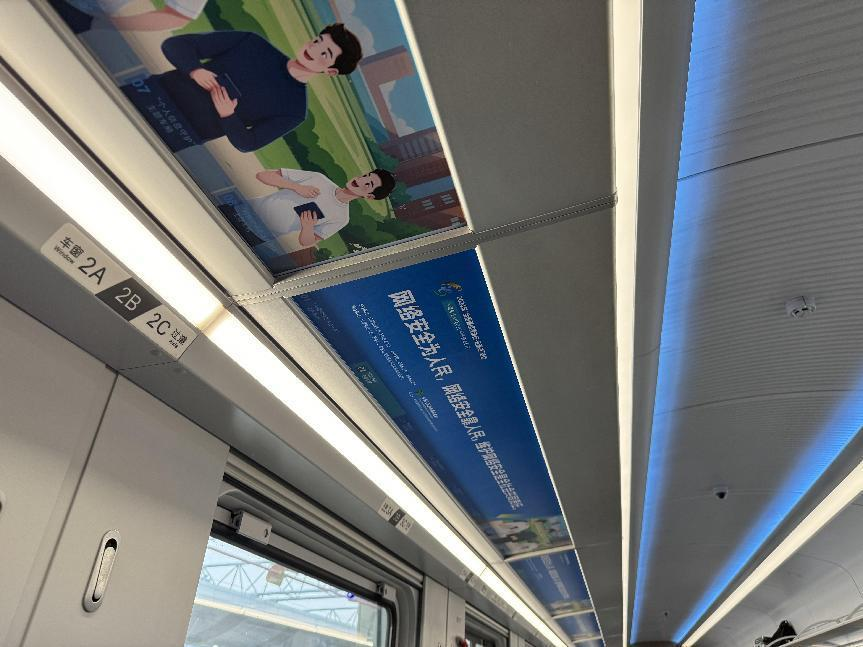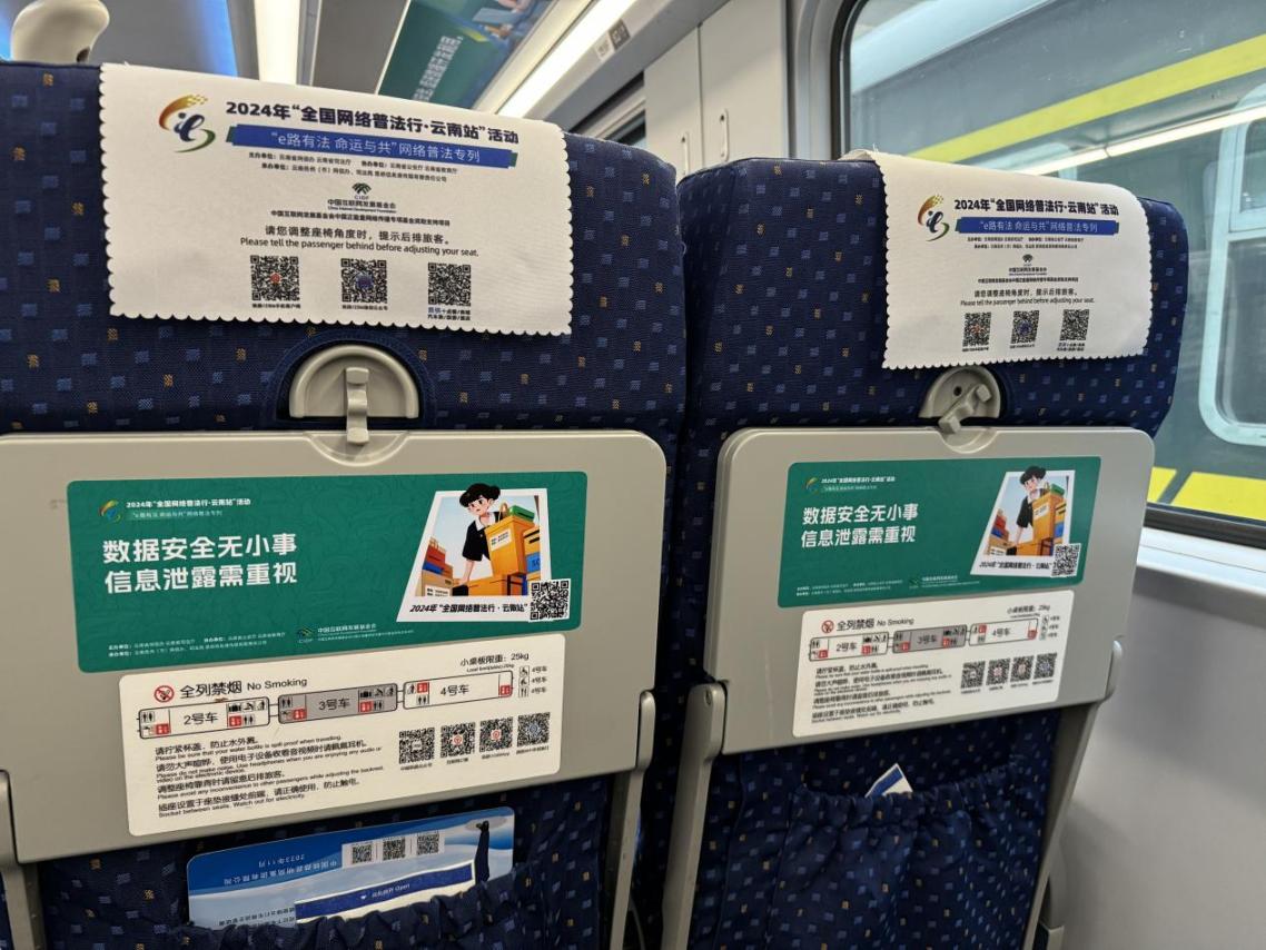 據(jù)介紹,專列的8個主題車廂分別以“中國網(wǎng)絡(luò)法治三十年”“網(wǎng)絡(luò)安全”“數(shù)據(jù)安全”“未成年人網(wǎng)絡(luò)保護”“數(shù)據(jù)出境之旅”“反網(wǎng)暴凈網(wǎng)行動”“個人信息守護”以及“網(wǎng)絡(luò)空間命運共同體”命名,通過鏡框海報、玻璃貼、小桌板貼、行李架彩貼、頭枕片、車內(nèi)LED信息屏等形式多樣的載體,全面展示網(wǎng)絡(luò)法治30年成就、網(wǎng)絡(luò)空間命運共同體主張。讓乘客們在享受舒適旅途的同時,也能輕松學(xué)習(xí)到實用的法律信息。