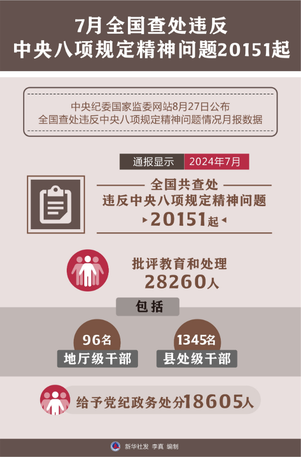 中央紀(jì)委國家監(jiān)委網(wǎng)站27日公布全國查處違反中央八項規(guī)定精神問題情況月報數(shù)據(jù)。通報顯示,今年7月,全國共查處違反中央八項規(guī)定精神問題20151起,批評教育和處理28260人(包括96名地廳級干部、1345名縣處級干部),給予黨紀(jì)政務(wù)處分18605人。