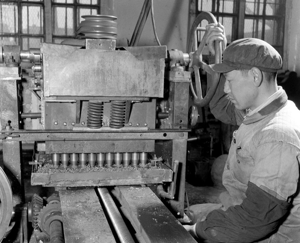 1958年2月12日,哈爾濱機(jī)聯(lián)機(jī)械廠四車間老工人宋振東(鉗工),經(jīng)過一月多的刻苦鉆研,創(chuàng)造出一臺(tái)多頭鉆床,它的生產(chǎn)效率比一般鉆床要提高效率11倍。新華社記者佟德印攝