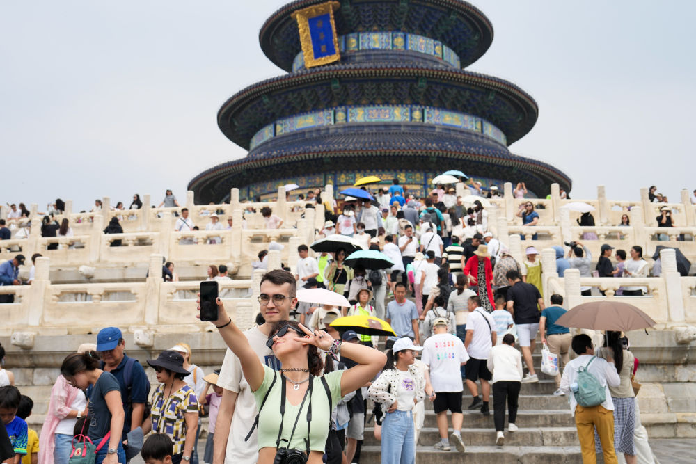 7月9日,兩名外國游客在北京天壇公園祈年殿前自拍合影。新華社記者 鞠煥宗 攝