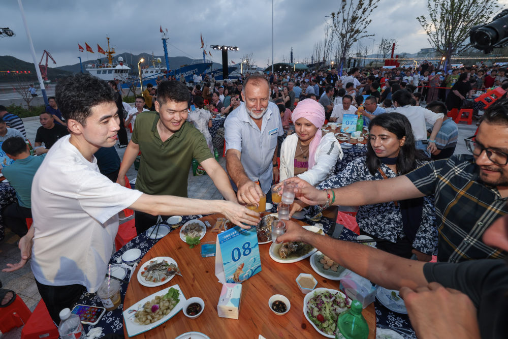 8月23日,游客在岱山縣長涂鎮(zhèn)舉行的海島特色黃魚宴上舉杯。新華社記者 徐昱 攝