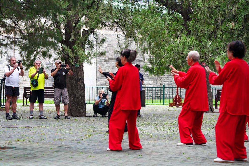 7月2日,在北京天壇公園,幾位外國游客在觀看太極拳。新華社記者 鞠煥宗 攝