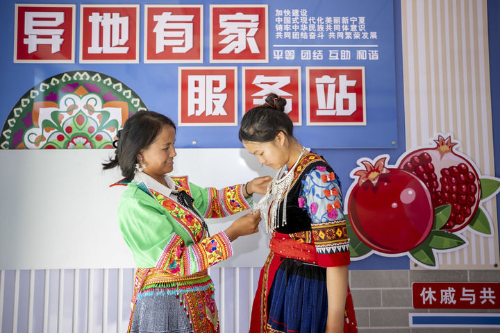 在寧夏青銅峽市瞿靖鎮(zhèn)毛橋村“異地有家”服務(wù)站,來(lái)自貴州的苗族務(wù)工人員楊文高(左)在給放暑假的大女兒整理服飾。楊文高將民族服飾從老家?guī)У綄幭模诠ぷ髦嗑蜁?huì)穿上民族服飾(2024年8月23日攝)。新華社記者 楊植森 攝