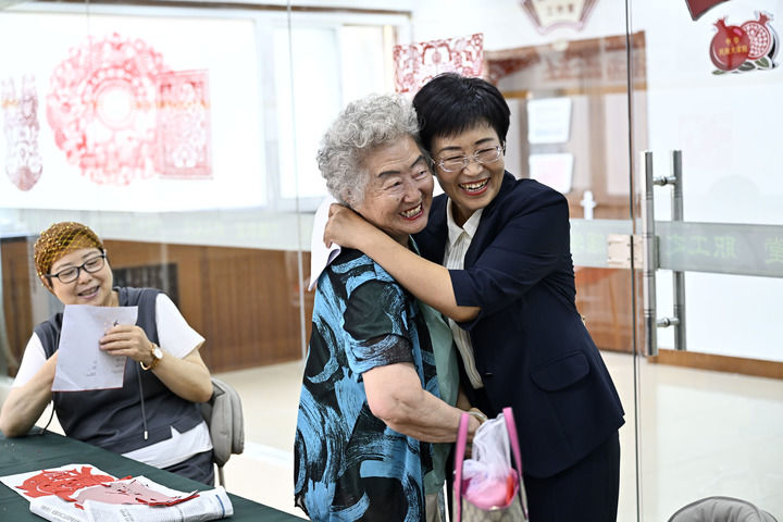 寧夏銀川市金鳳區(qū)長(zhǎng)城花園社區(qū)書(shū)記趙耐香(右一)在社區(qū)“才藝堂”與居民交流(2024年6月20日攝)。新華社記者 王鵬 攝