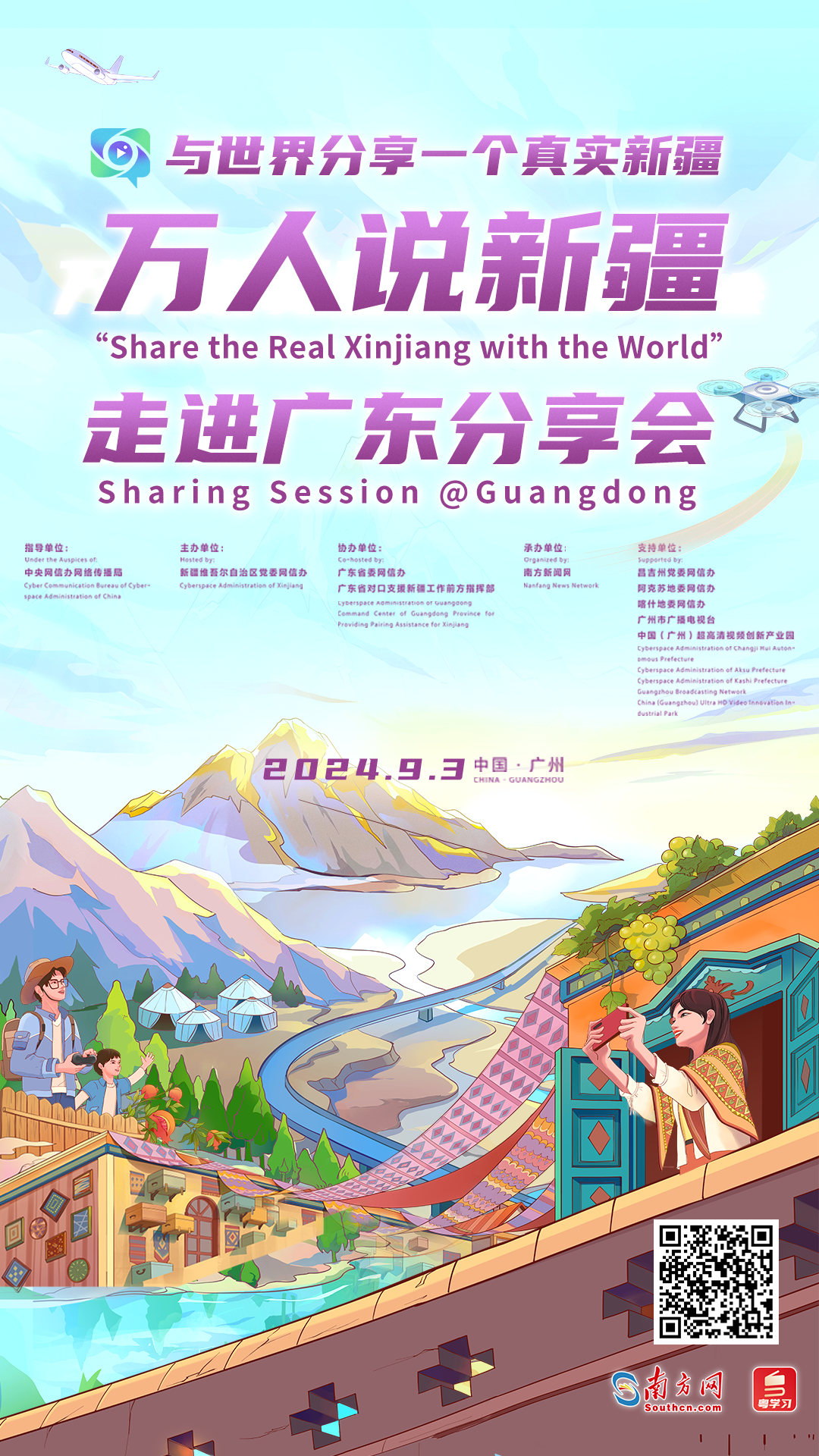 在交流互鑒中把新疆溫柔地說與全世界,在新粵兩地合作中感悟跨“粵”千里的援疆故事?!叭f人說新疆”走進(jìn)廣東分享會(huì)將于9月2日至3日在廣州舉行。此次活動(dòng)由新疆維吾爾自治區(qū)黨委網(wǎng)信辦主辦,廣東省委網(wǎng)信辦、廣東省對口支援新疆工作前方指揮部協(xié)辦,南方新聞網(wǎng)承辦。分享會(huì)從國內(nèi)知名學(xué)者、外籍專家、海內(nèi)外博主、援疆干部、港澳青年等不同視角,講述有溫度、有情懷、接地氣的美好新疆故事。