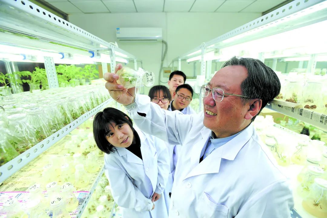 沈陽(yáng)農(nóng)業(yè)大學(xué)教授李天來(lái)院士在實(shí)驗(yàn)室指導(dǎo)研究生開(kāi)展科研,觀察番茄遺傳轉(zhuǎn)化過(guò)程等情況。