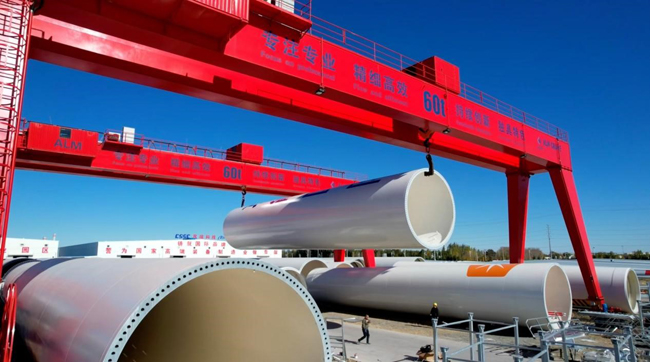 蒙東(通遼)風(fēng)電裝備制造產(chǎn)業(yè)基地內(nèi),一排排風(fēng)葉和塔筒即將運往全國各地。林林?jǐn)z