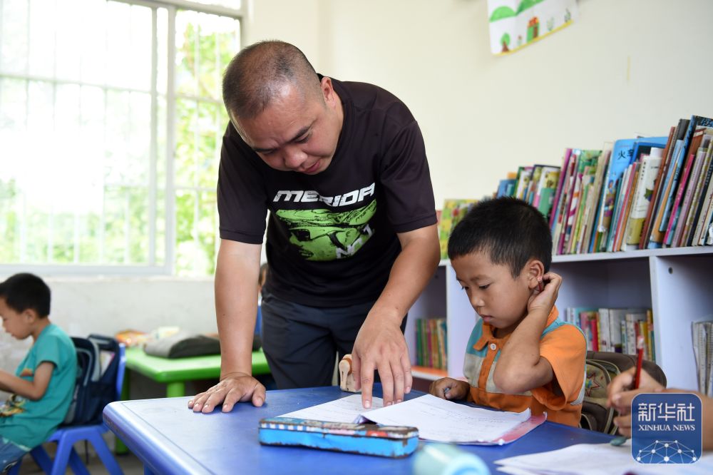 在廣西天等縣龍茗鎮(zhèn)東南村煙屯教學(xué)點(diǎn),“80后”老師董祥在輔導(dǎo)學(xué)生功課(2015年6月23日攝)。