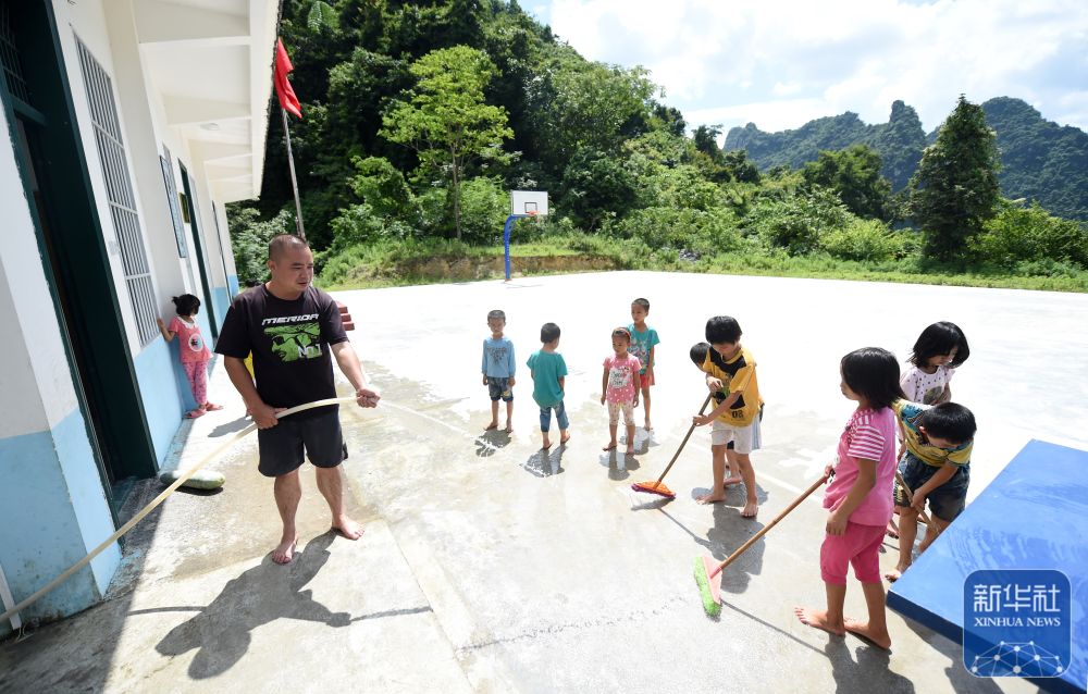 在廣西天等縣龍茗鎮(zhèn)東南村煙屯教學(xué)點(diǎn),“80后”老師董祥在和學(xué)生一起做衛(wèi)生(2015年6月23日攝)。