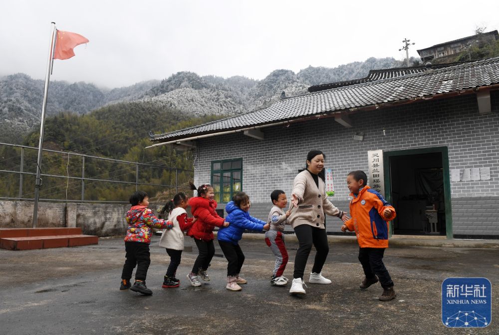 在廣西靈川縣蘭田瑤族鄉(xiāng)東良教學(xué)點(diǎn),“85后”老師石夏月和學(xué)生做游戲(2022年2月24日攝)。