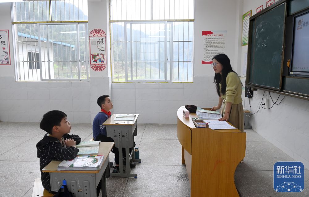 在廣西灌陽(yáng)縣洞井瑤族鄉(xiāng)野豬殿小學(xué),“95后”老師趙艷在給學(xué)生上課(2024年3月27日攝)。