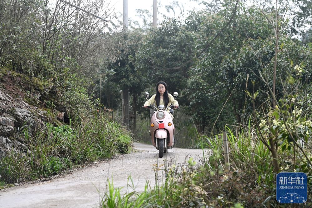 在廣西灌陽(yáng)縣洞井瑤族鄉(xiāng)野豬殿村,“95后”老師趙艷騎著電動(dòng)自行車從學(xué)?;丶遥?024年3月27日攝)。