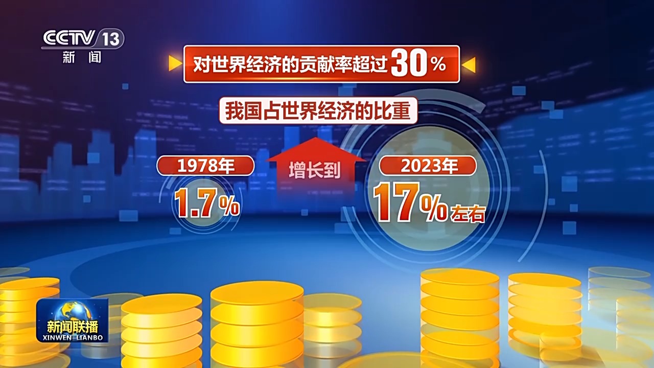 我國占世界經(jīng)濟(jì)的比重,從有數(shù)據(jù)統(tǒng)計(jì)以來的1978年的1.7%,增長到2023年的17%左右,對(duì)世界經(jīng)濟(jì)的貢獻(xiàn)率超過30%。
