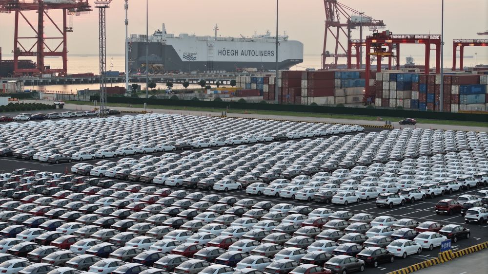 汽車運輸船“禮諾極光”輪靠泊江蘇省蘇州港太倉港區(qū),即將裝載2336輛汽車首航歐洲(無人機照片,8月23日攝)。