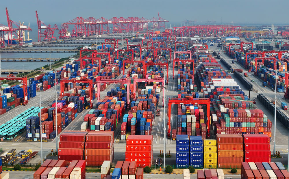江蘇省蘇州港太倉港區(qū)集裝箱碼頭,集裝箱吞吐作業(yè)繁忙(無人機照片,8月10日攝)。