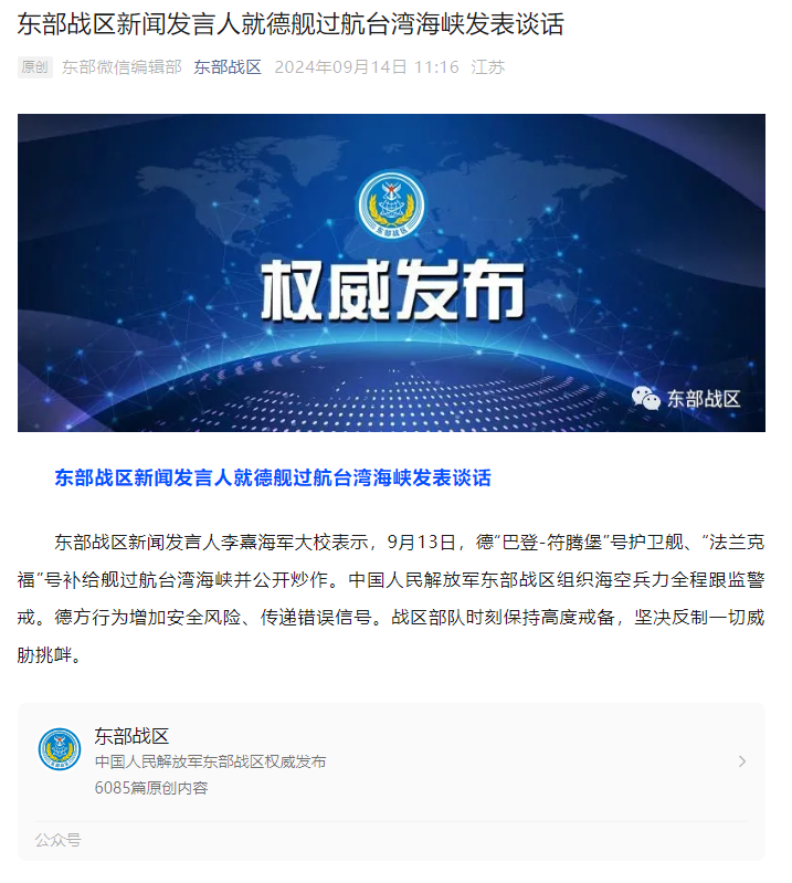 東部戰(zhàn)區(qū)新聞發(fā)言人李熹海軍大校表示,9月13日,德“巴登-符騰堡”號護衛(wèi)艦、“法蘭克?!碧栄a給艦過航臺灣海峽并公開炒作。中國人民解放軍東部戰(zhàn)區(qū)組織海空兵力全程跟監(jiān)警戒。德方行為增加安全風險、傳遞錯誤信號。戰(zhàn)區(qū)部隊時刻保持高度戒備,堅決反制一切威脅挑釁。