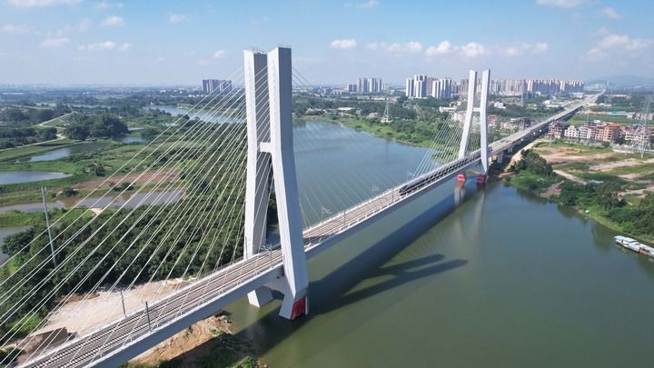 2023年9月26日,廣汕高鐵正式開通運營,列車經過位于廣州市增城區(qū)的廣汕高鐵增江特大橋(無人機照片)。新華社記者 田建川 攝