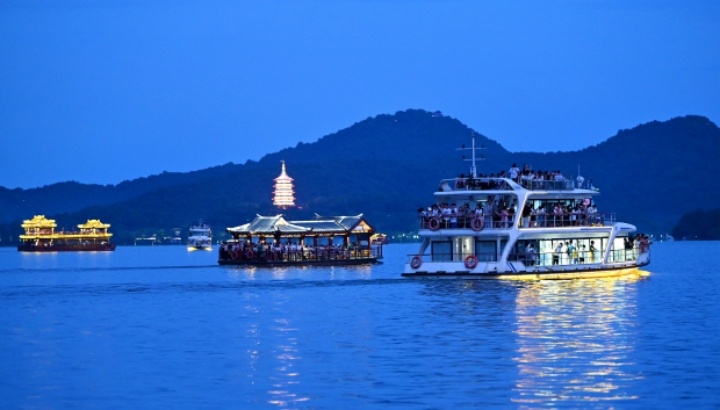 傍晚時(shí)分,游客們乘船夜游西湖