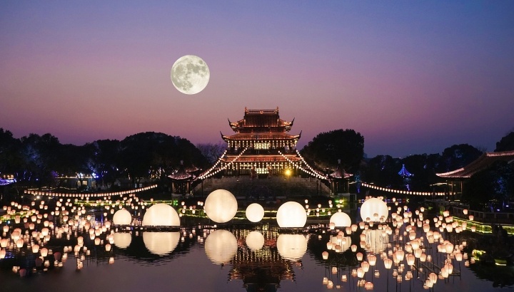 江蘇蘇州,水面圓形花燈與天上滿(mǎn)月相映成趣