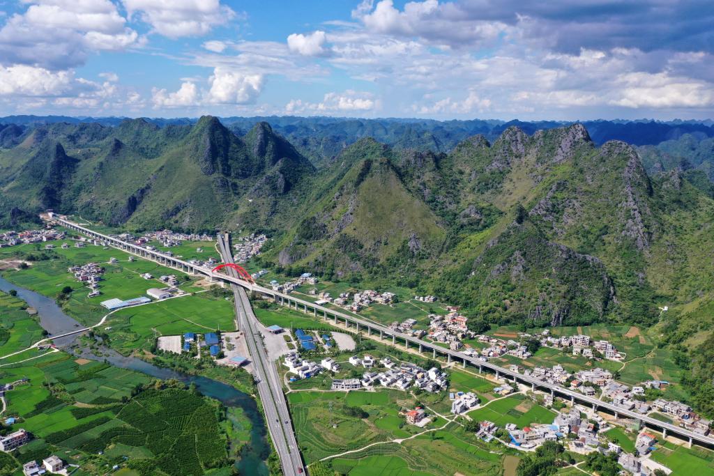 這是廣西都安瑤族自治縣境內(nèi)的交通路網(wǎng)(2021年8月31日攝,無(wú)人機(jī)照片)。新華社記者 陸波岸 攝