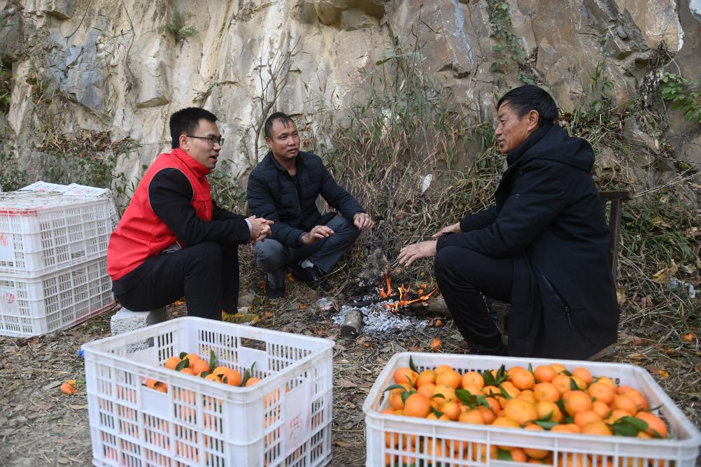 2023年12月25日,在廣西百色市樂(lè)業(yè)縣新化鎮(zhèn)百坭村,百色市委宣傳部駐百坭村第一書(shū)記農(nóng)俊海(左一)向群眾了解砂糖橘行情。新華社記者 陸波岸 攝