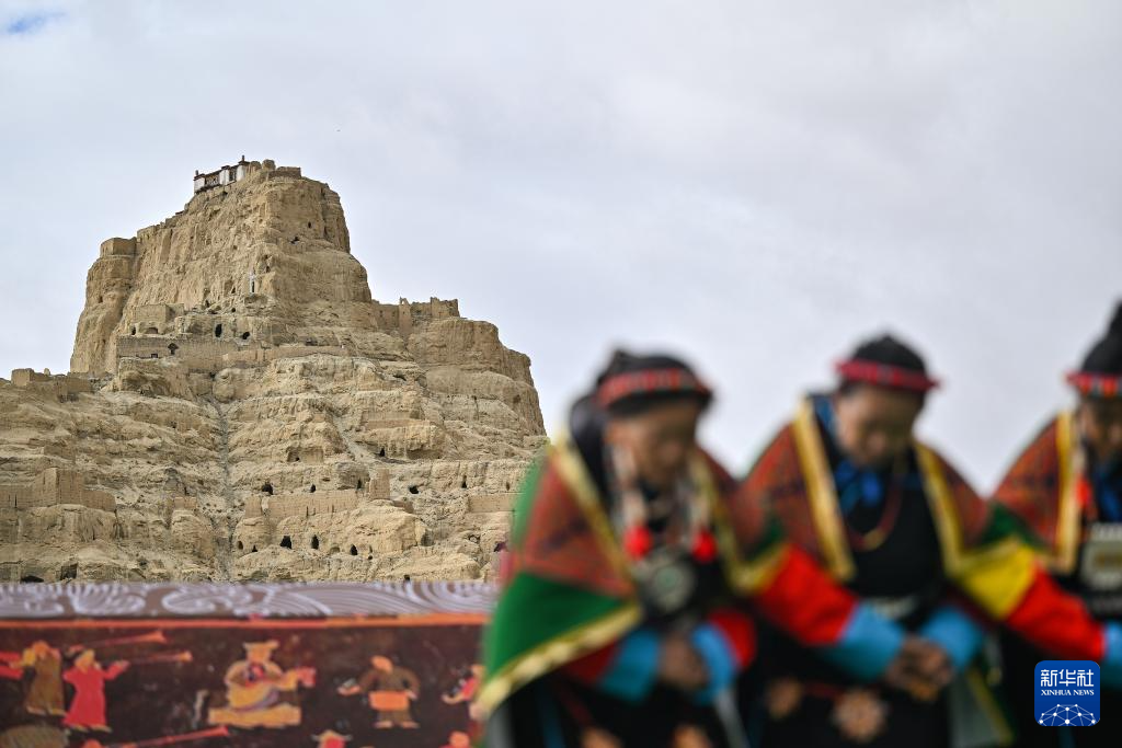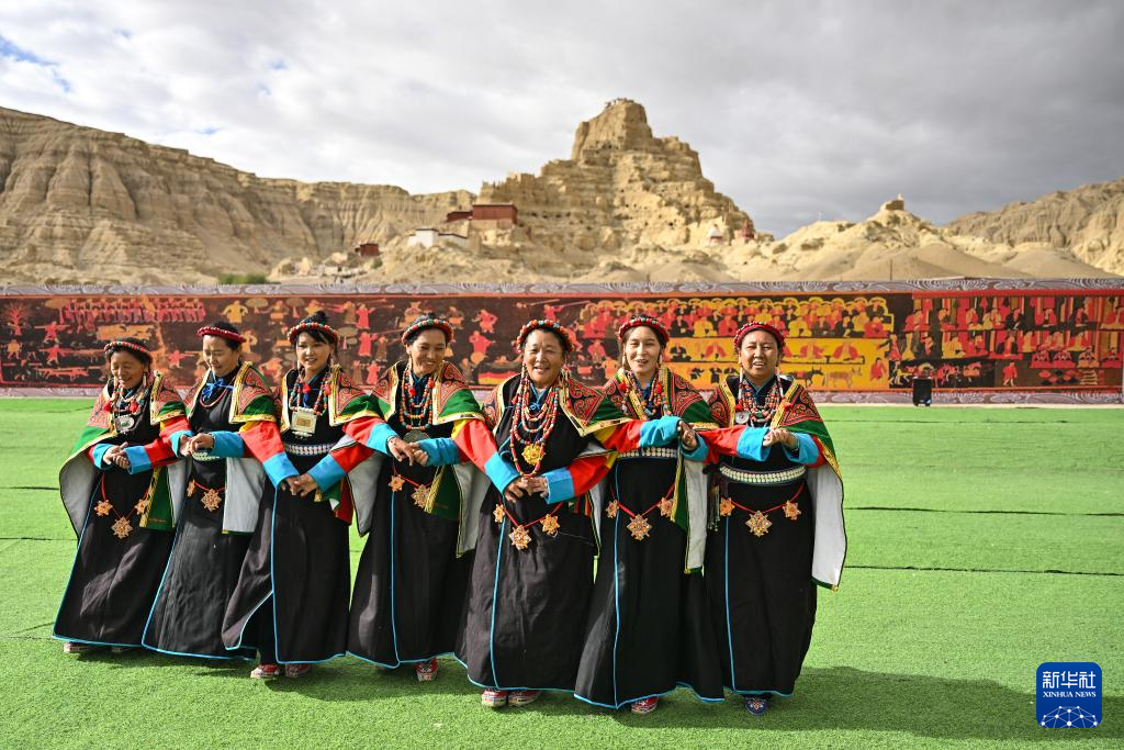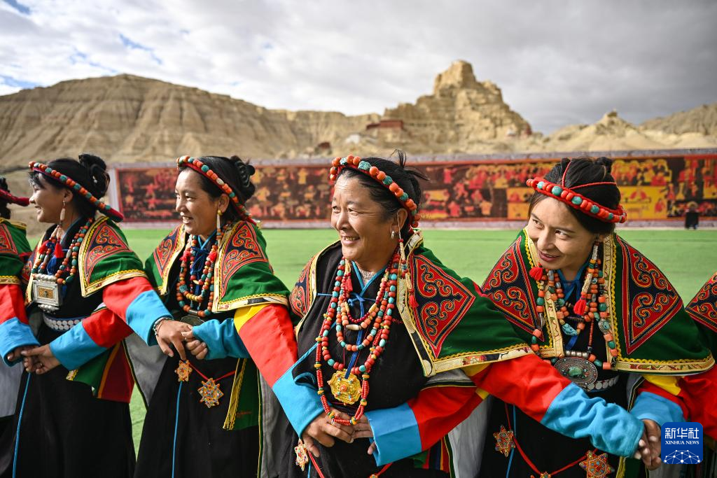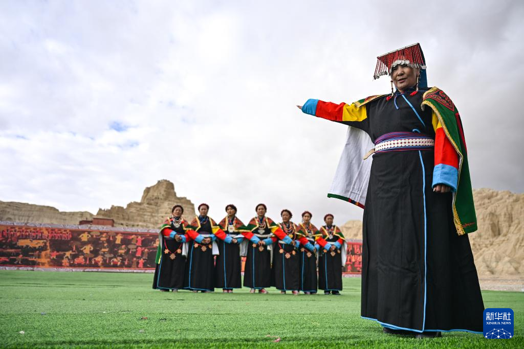 在西藏阿里地區(qū)札達(dá)縣古格王國遺址腳下,自治區(qū)級(jí)“宣舞”非遺傳承人央金(右)介紹“宣舞”(9月11日攝)。